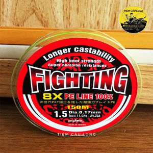 Dòng dây Pe Fighting X8 được nhiều người sử dụng vì độ mượt rất tốt, lực tải cá khá là cao, sợi dây có màu xanh hòa mình với dòng nước rất phù hợp để câu Lure. Sợi dây có độ dài 150m thích hợp vào các loại máy câu lure